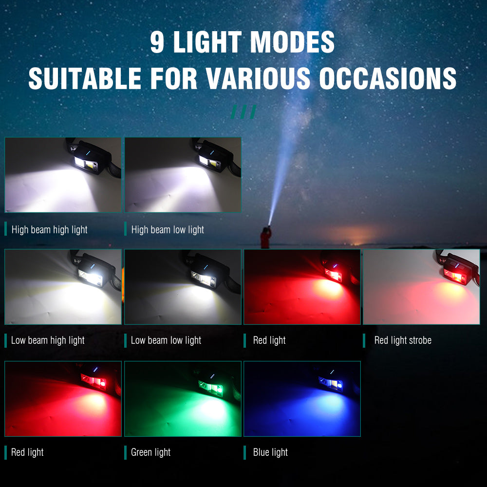 Επαναφορτιζόμενος αδιάβροχος φακός κεφαλής ΧPRΜ με αισθητήρα κίνησης Sensor και με δυνατότητα φωτισμού μπλε, πράσινου και κόκκινου φωτός. Ο αισθητήρας κίνησης σας διευκολύνει να ανάβετε ή να σβήνετε τον φακό περνώντας το χέρι σας μπροστά του, χωρίς να πρέπει να αγγίξετε τον φακό. Διαθέτει στεγανό προστατευτικό στην θύρα USB ώστε να μην βραχυκλώσει αν βράχει. Ο φακός είναι κατασκευασμένος από υλικό ABS, έξτρα ελαφρύς (!) με συνολικό βάρος μόνο 80 γραμμάρια (μαζί με την μπαταρία). Λειτουργεί με μια επαναφορτιζόμενη μπαταρία 3.7V/1000mAh Li-polymer η οποία περιλαμβάνεται και φορτίζει πάνω στο σώμα του φακού μέσω του καλωδίου USB που περιέχεται στην συσκευασία. Προσαρμόζεται εύκολα στον καθένα, χάρη στη βάση στήριξης και στον ελαστικό ρυθμιζόμενο ιμάντα που διαθέτει. Χρόνος πλήρης φόρτισης : 3-4 ώρες